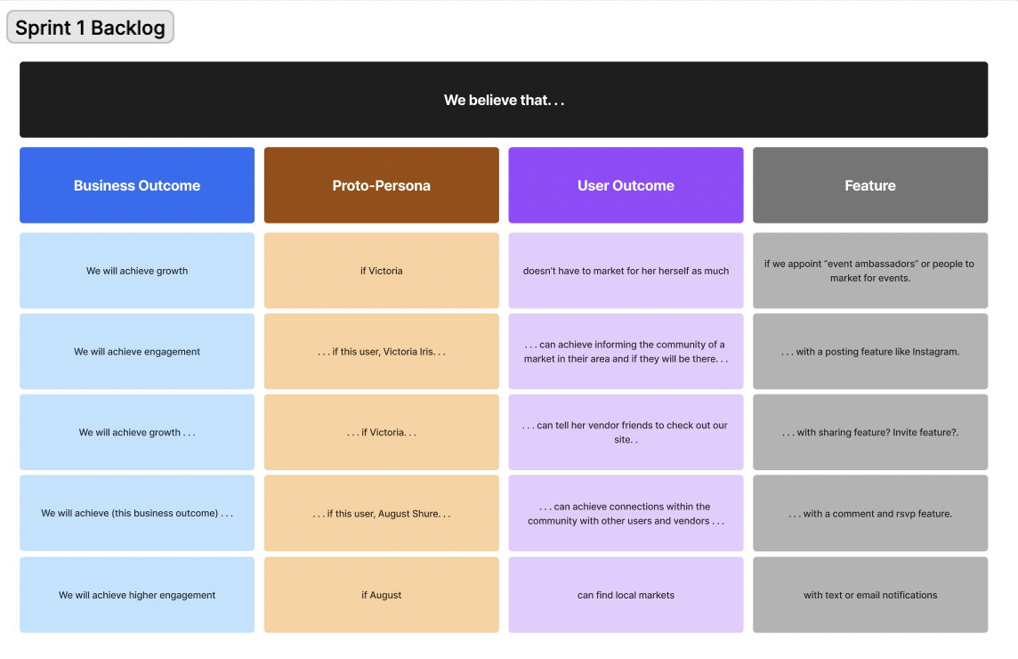 This project was pitched during my fall 2023 Interaction Design 2 Class, and I was selected as a team lead. My team used Lean UX to create a digital website for anyone interested in attending local pop-up markets in their area by creating a centralized website where you can find all of the up-to-date information on what markets are in your area. Below you will find the series of sprints of Lean UX we used to understand our users’ needs.