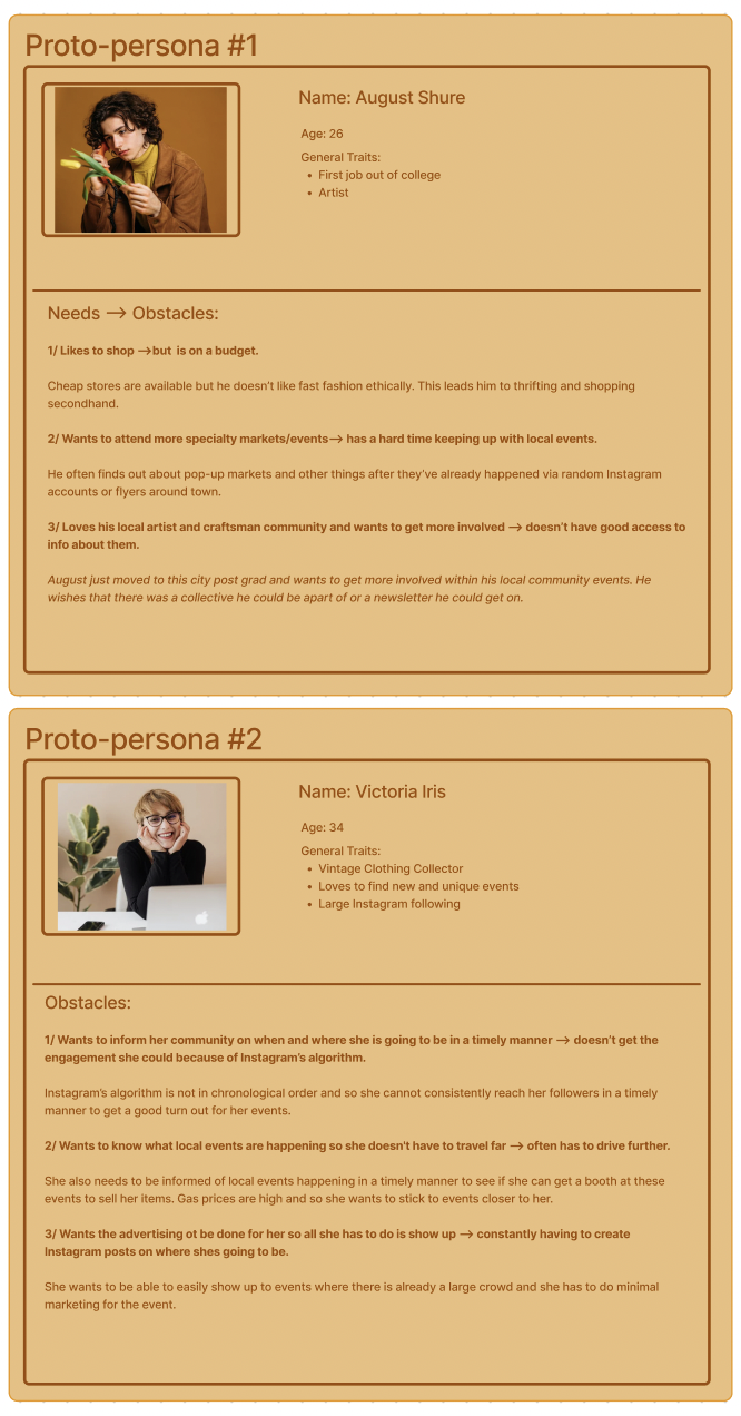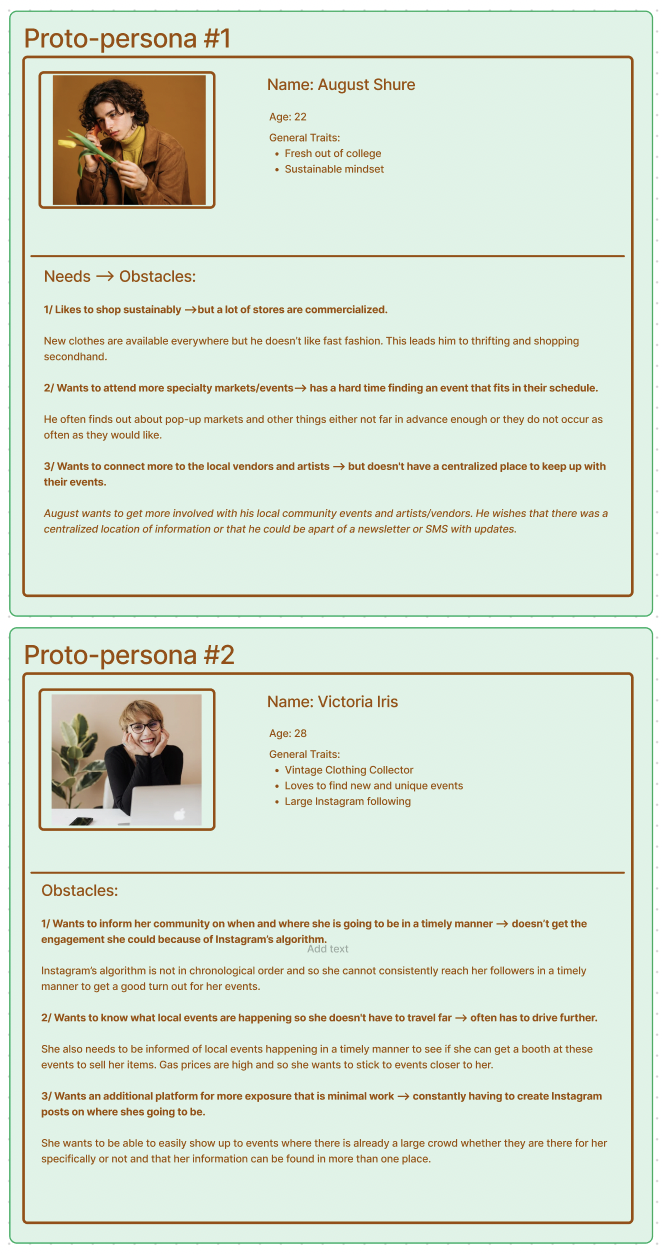 We changed our first Proto-Persona because, after our interviews, we realized our obstacles’ needs were not the reality of what our participants were telling us. We realized that people like to thrift not because it is cheaper but because they are against cheap fast fashion and commercialized shopping. Finding a good deal occasionally is just a bonus.